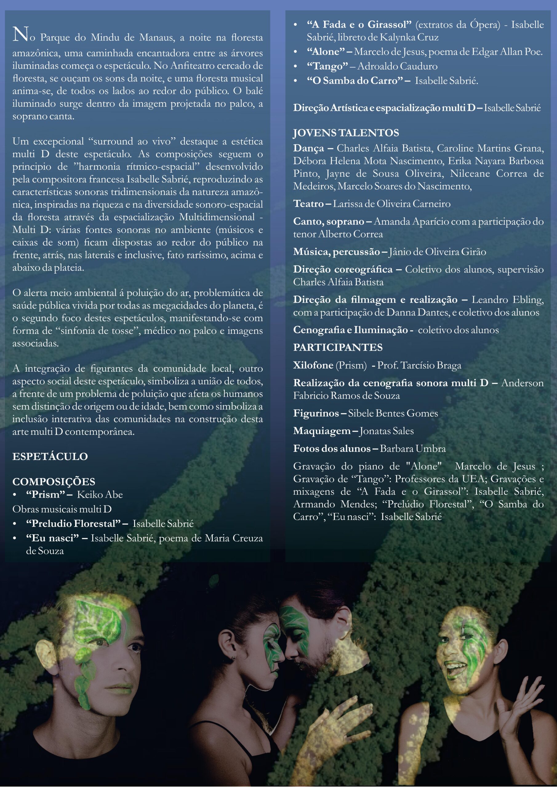 “Isabelle conceived “Musical and Choreographic Sculptures of the forest ”, a transdisciplinary project combining ballet, orchestral music, acoustic engineering and audiovisual projection, based on the sound spatialization [of forests] … …” It is about inventing the arts multi D of the 21st century, erudite, popular and ethnic, interspecies and ecological, here in the Amazon”.