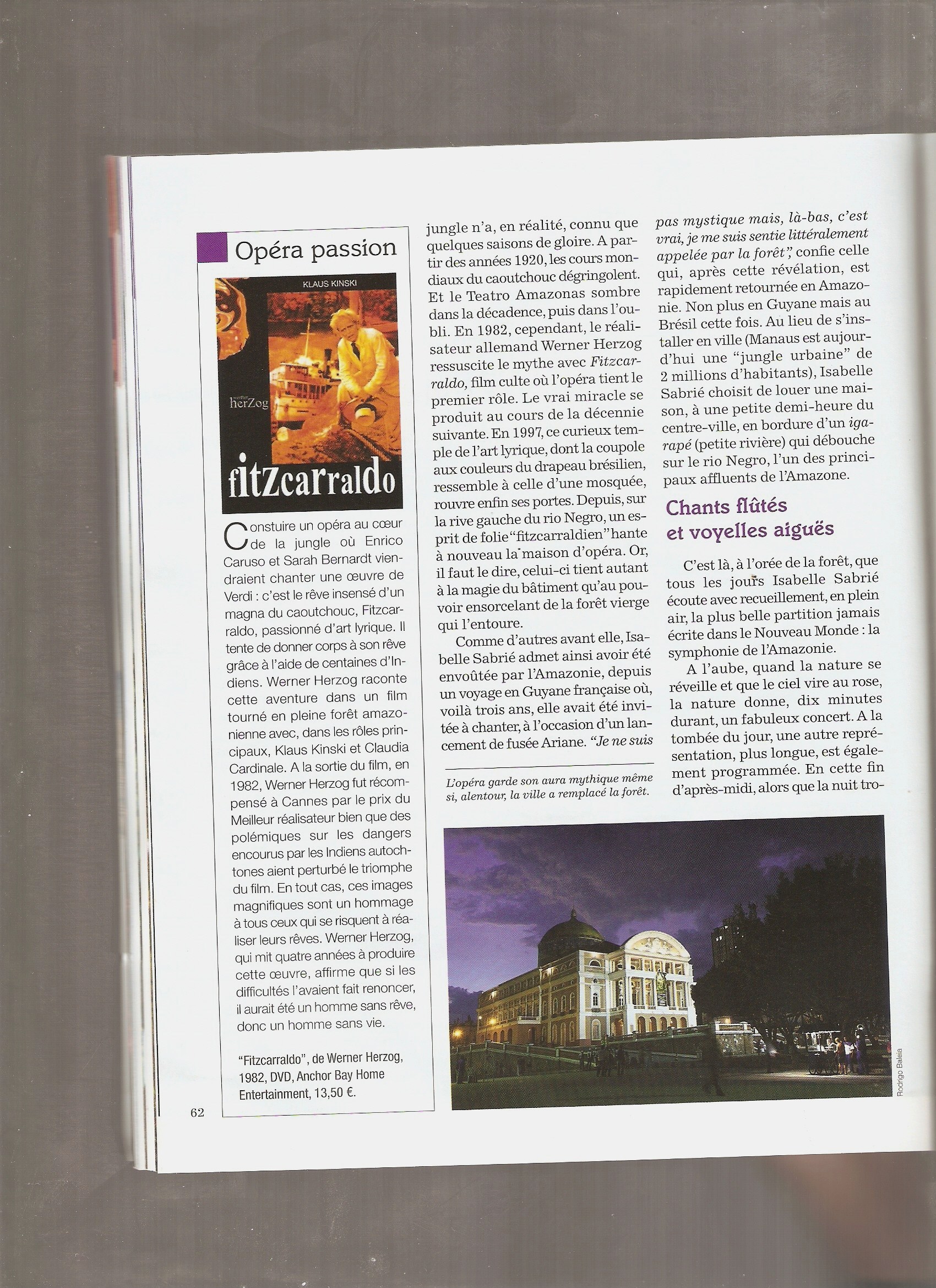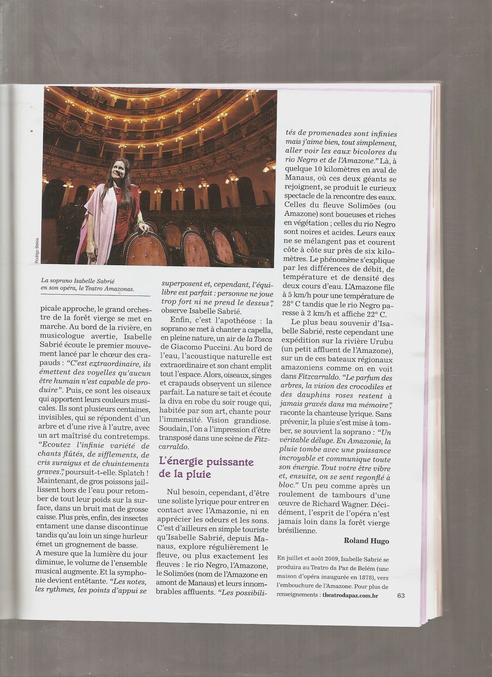 “The great orchestra of the rainforest starts to play… … The notes, the rhythms, the points of accents are superimposed, and however, the balance is perfect: nobody plays too loud nor takes over, observe Isabelle Sabrié. Finally it is the apotheosis : the soprano starts to sing a capella, in the middle of nature, an aria from Puccini’s Tosca. At the water’s edge, the natural acoustic quality is extraordinary and her singing fills the whole space. Then birds, monkeys and toads observe a perfect silence. Nature is quiet and listens to the diva in her red evening dress who, penetrated by her art, sings for the immensity… “